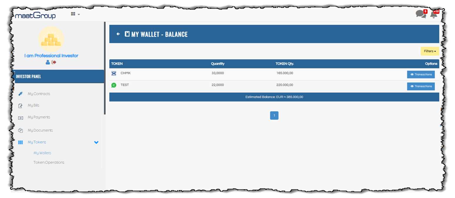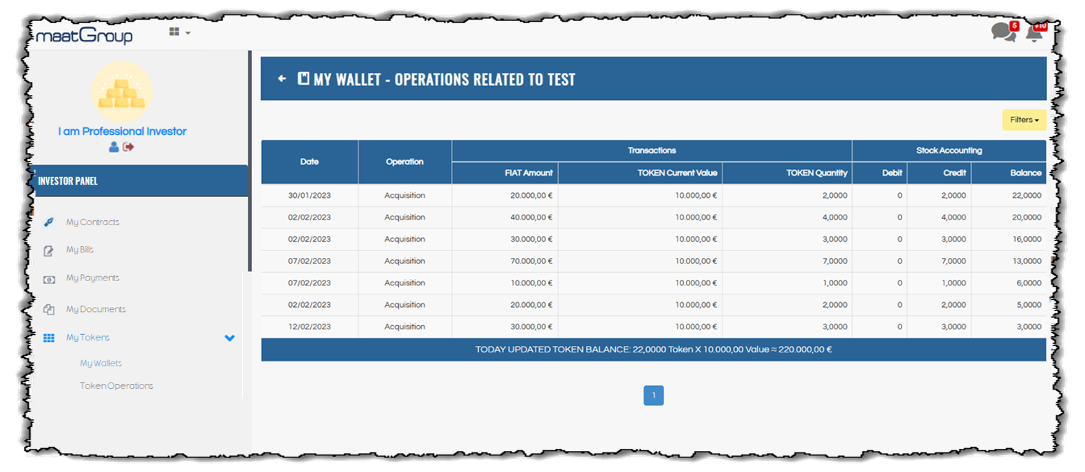 By accessing each of his Wallets, the Investor will have a consolidated view of his Tokens deposited, with their corresponding particular balance
